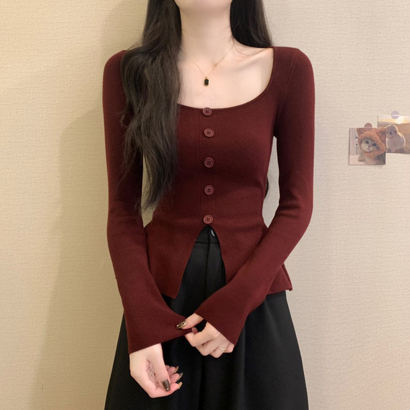 春秋冬薄款方领修身收腰长袖打底针织衫上衣设计感开叉毛衣女内搭