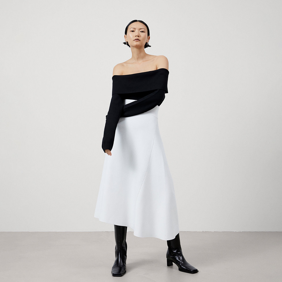 西班牙极简设计师 女款 一字领下开叉宽松长袖针织衫 D948