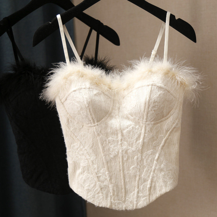 秋冬新款性感肚兜式收腰打底上衣时尚羽毛气质蕾丝内搭短款吊带女