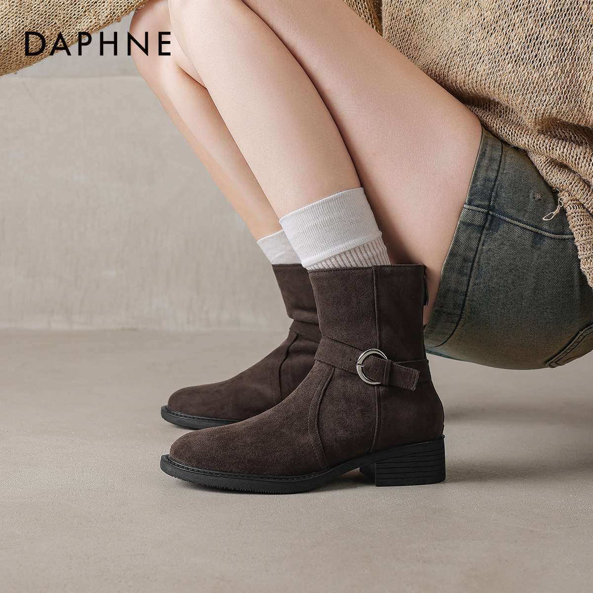 达芙妮绒面短靴女2025新款秋法式高跟瘦瘦靴粗跟马丁靴洋气靴子女