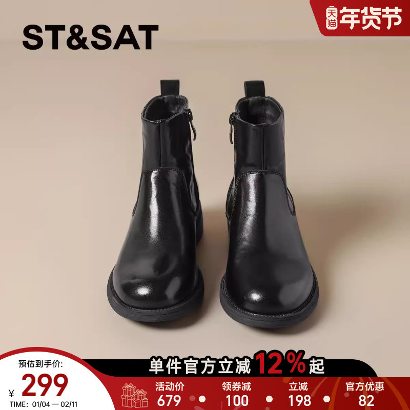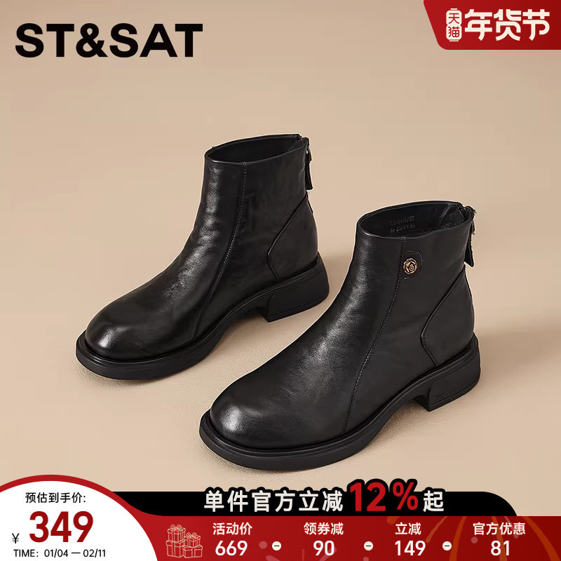 星期六粗跟马丁靴秋冬厚底大头靴黑色靴子真皮短靴女靴SS24116406