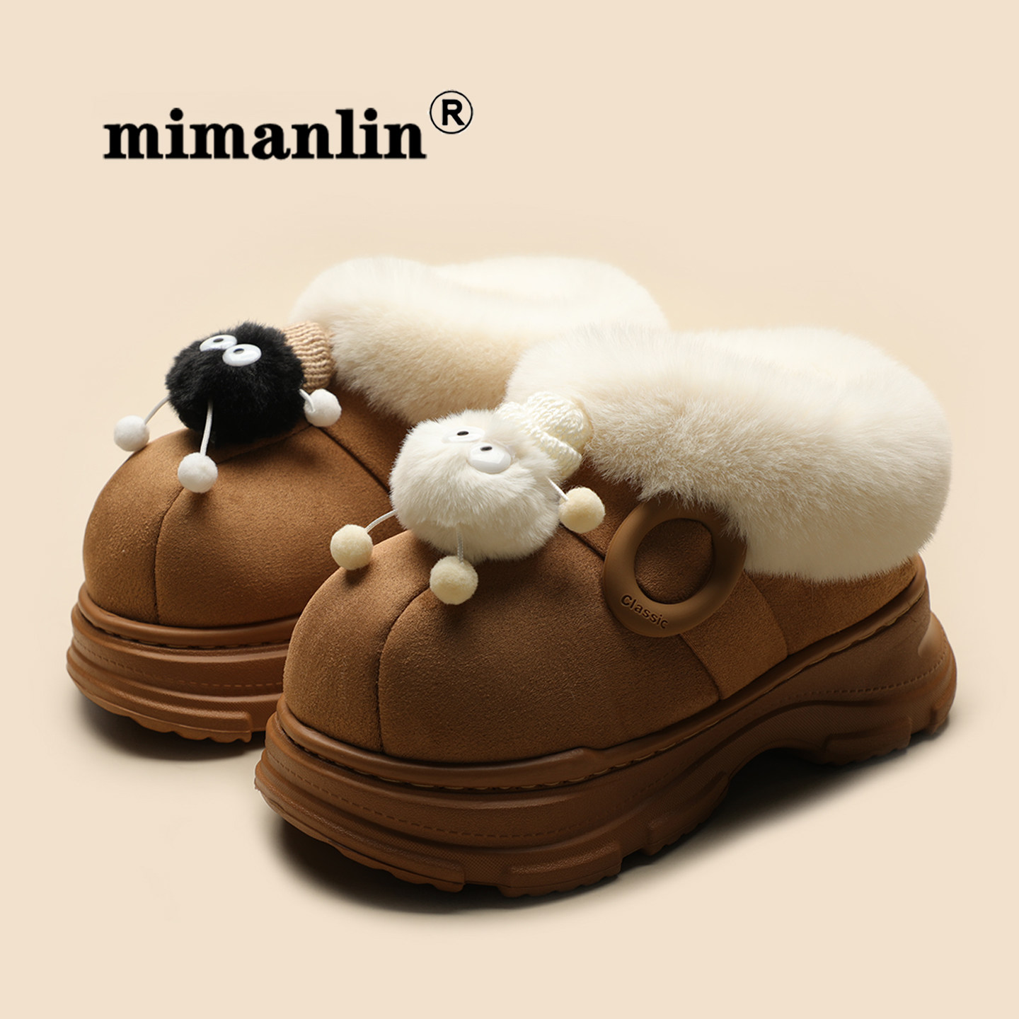 可爱卡通毛毛鞋女秋冬厚底加绒保暖外穿雪地靴松糕底一脚蹬棉拖鞋