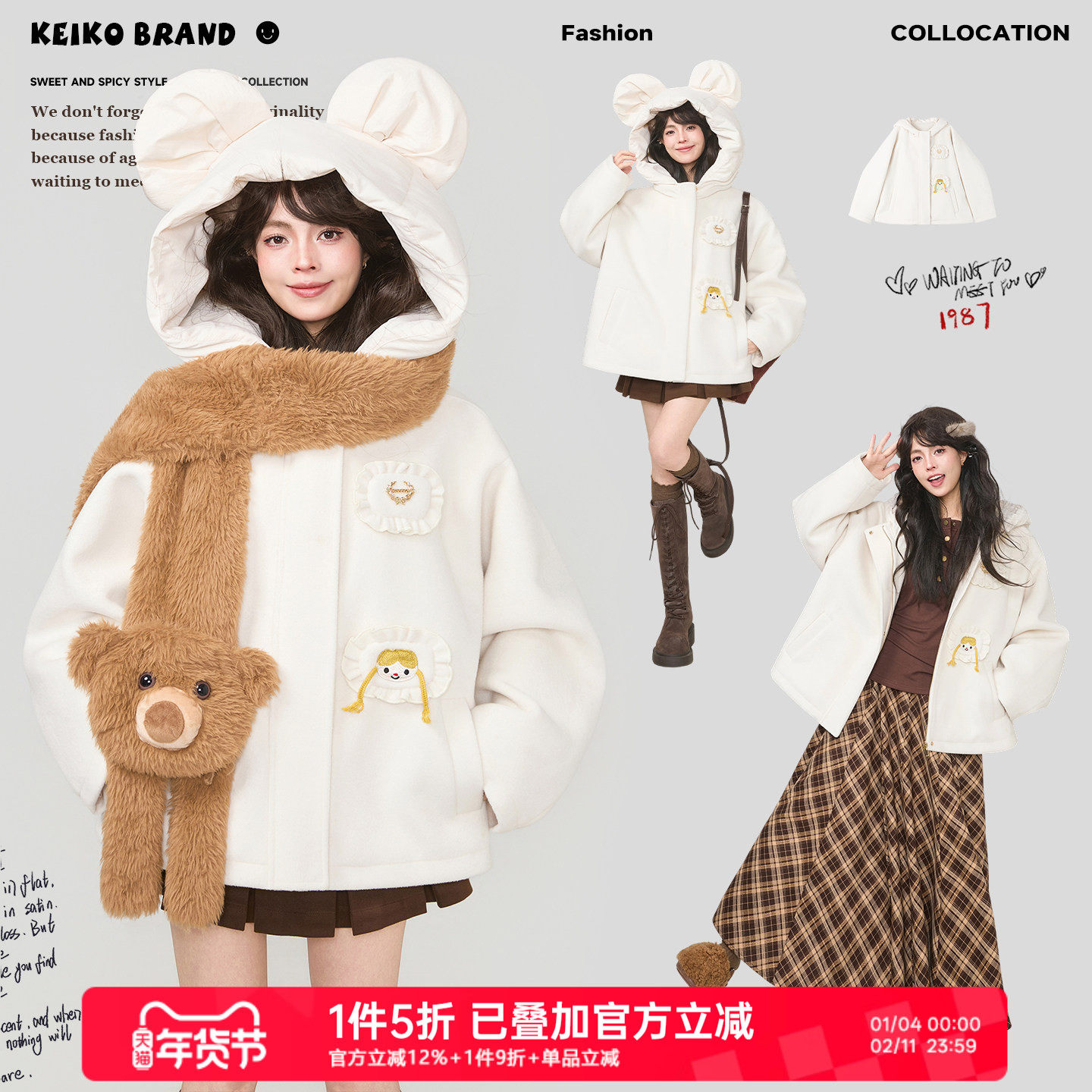 KEIKO 萌趣卡通连帽白色毛呢外套女25冬季少女感减龄夹棉保暖棉服