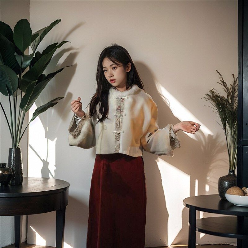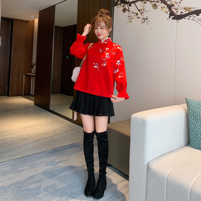 新中式旗袍连衣裙国风女套装加绒加厚新年少女毛呢外套红色秋冬款