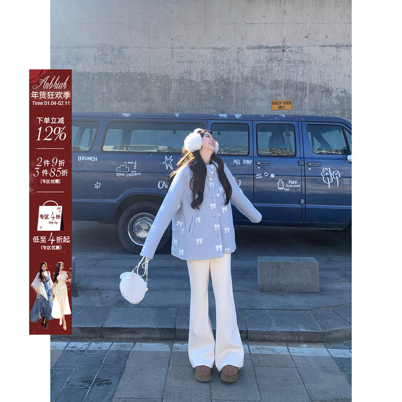 安妮不火 少女感蝴蝶结毛巾绣连帽呢外套女微胖大码显瘦毛呢外套