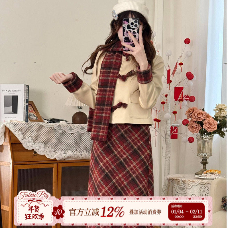 织物猪 草莓小熊 甜美少女毛呢外套女秋冬新年穿搭氛围感两件套