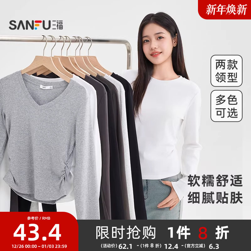 三福打底衫女2025新款秋季简约纯色收腰V领修身休闲长袖上衣女装