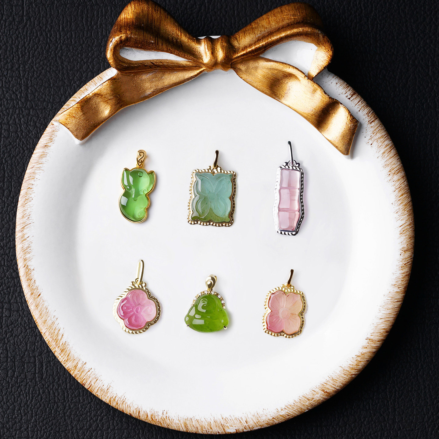 9K黄金镶嵌碧玺吊坠不褪色轻奢蓝绿西瓜色雕刻项链时尚百搭手链女