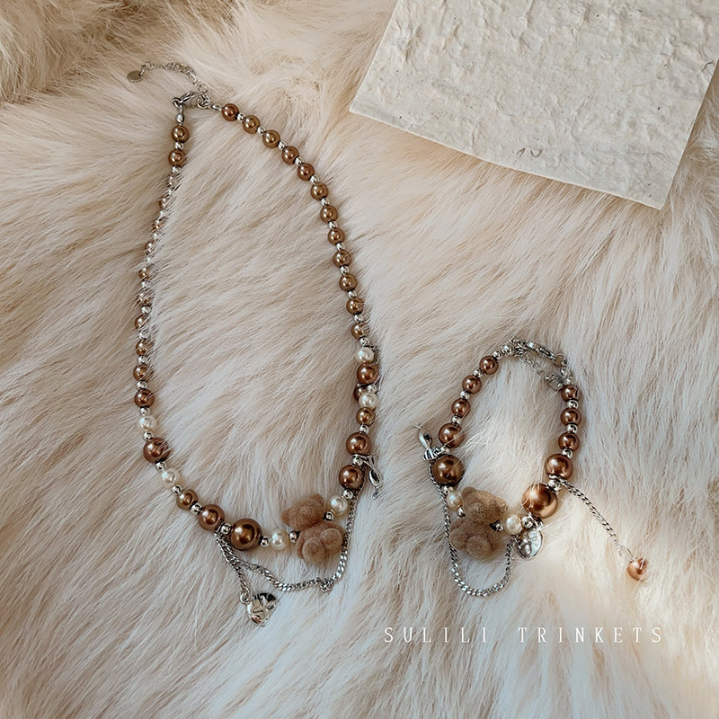 卡其色卡通可爱小熊手工串珠项链锁骨链高级感轻奢时尚百搭手链女
