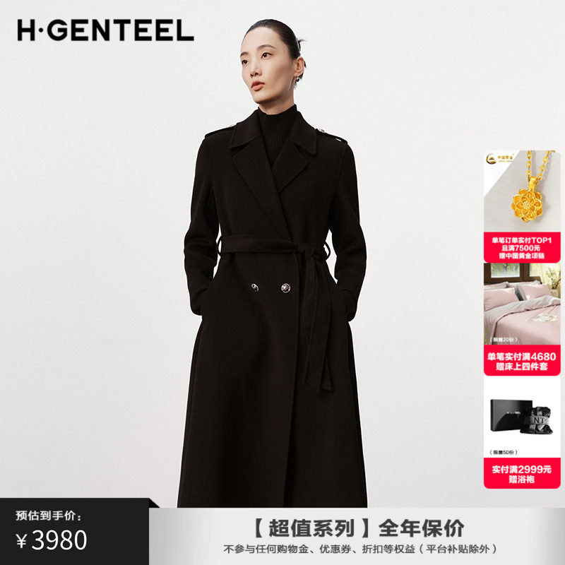 H·GENTEEL荷高新款冬装女系带收腰风衣式高级感黑色毛呢大衣女