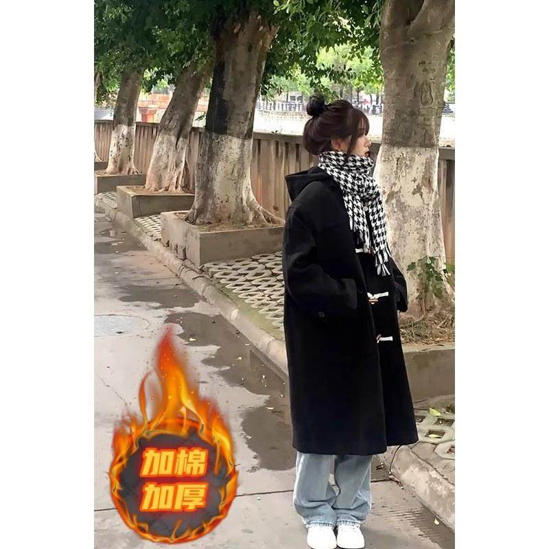 牛角扣黑色毛呢大衣女秋冬新款高级感小个子连帽呢子外套长款加绒