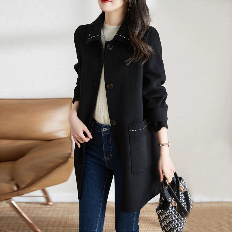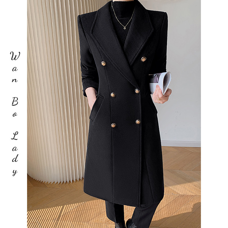 黑色毛呢大衣女中长款冬加厚职业装工作服西装领双面呢子羊毛外套