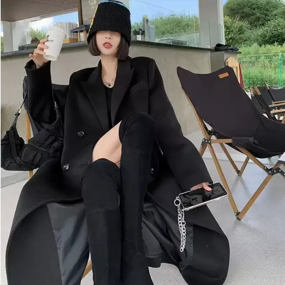 黑色毛呢大衣女中长款2023新款秋冬季宽松夹棉呢子西装外套加厚