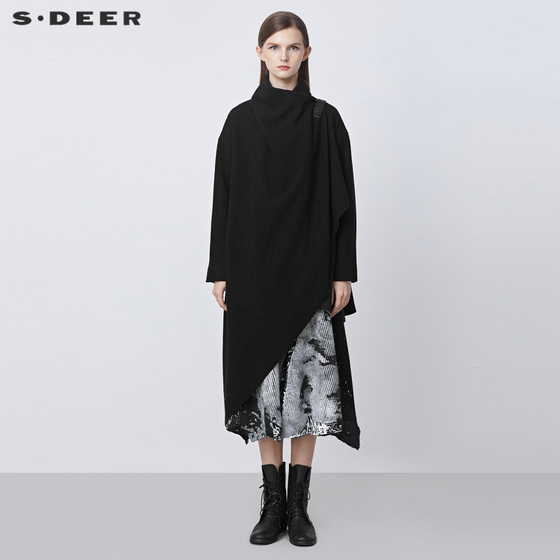 sdeer圣迪奥冬季高领皮扣不规则黑色毛呢大衣女S21481702