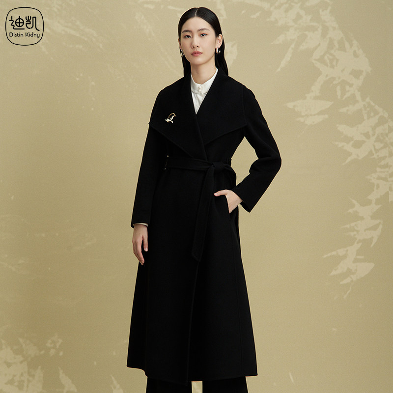 Distin Kidny/迪凯老钱风黑色毛呢大衣女中长款系带翻领通勤外套