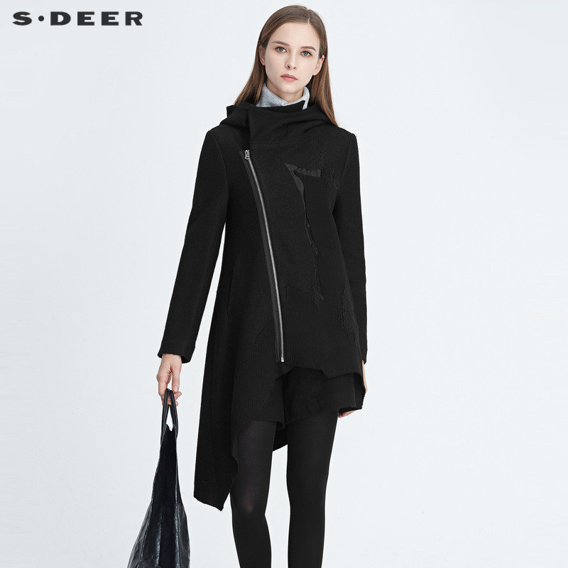 sdeer圣迪奥冬季高领连帽斜襟做旧磨破黑色毛呢大衣女S20481703