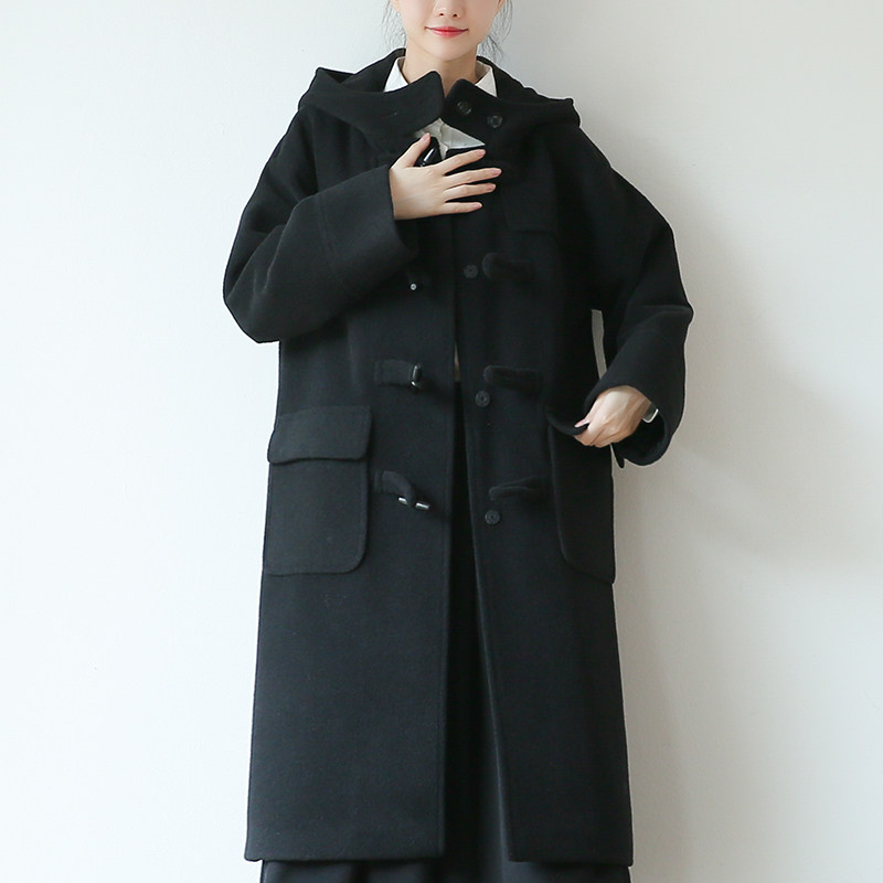 suin2021冬新文艺宽松长款牛角扣连帽黑色毛呢大衣女呢子休闲外套