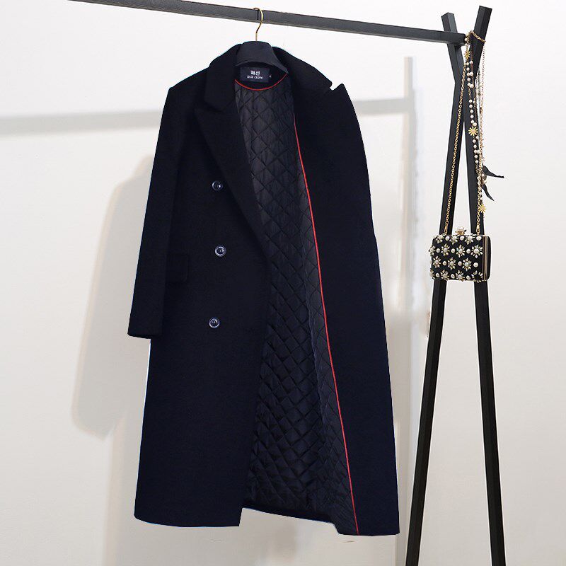 黑色毛呢外套女夹棉加厚秋冬季韩版加棉高个子加长款正肩呢子大衣