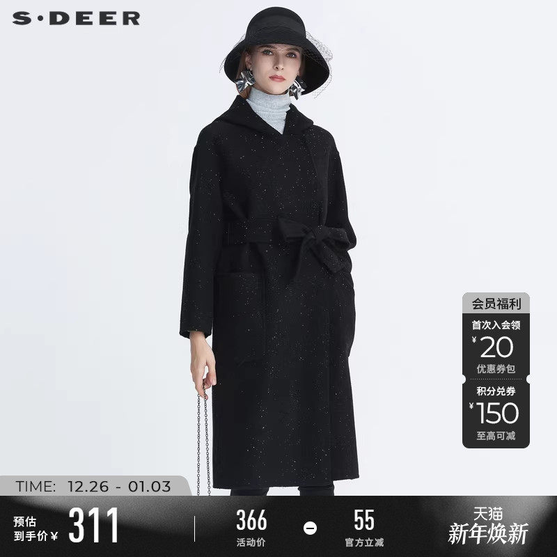 sdeer圣迪奥冬季休闲连帽亮片收腰中长款黑色毛呢大衣女S20481813