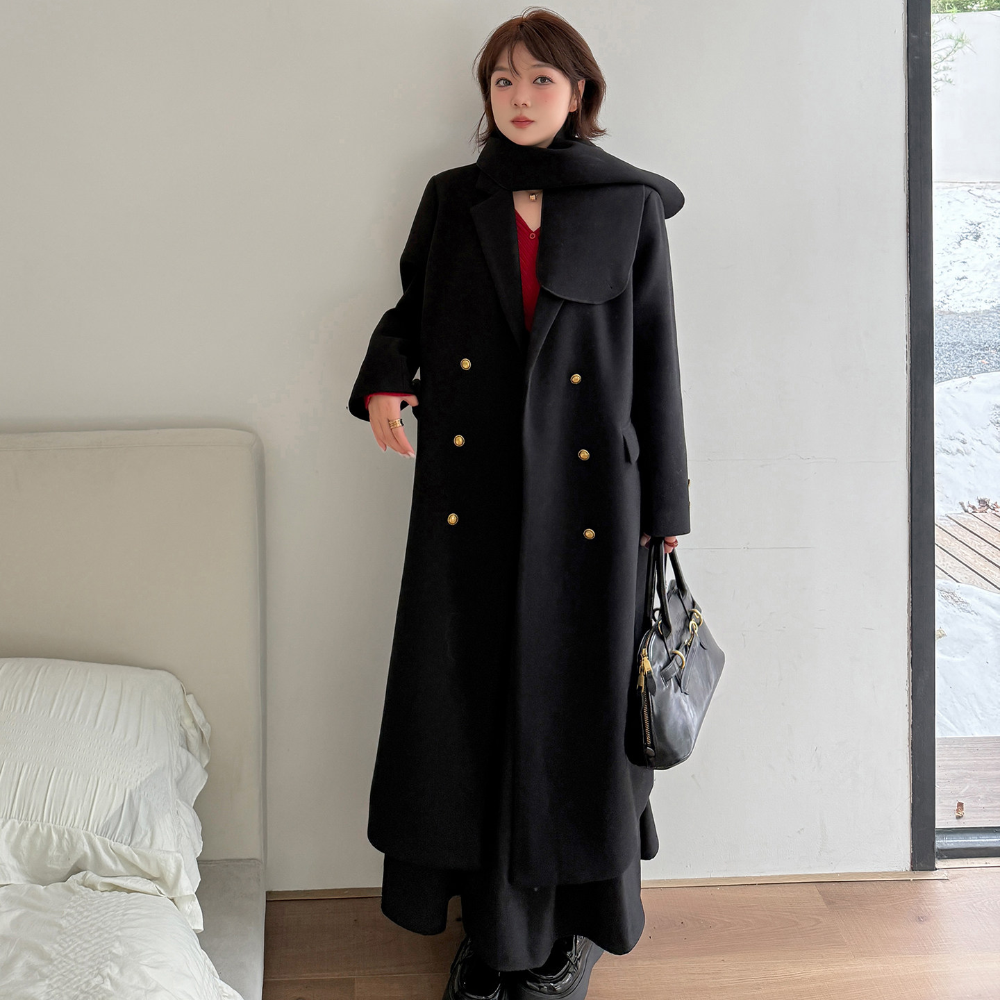 - 长款黑色呢子大衣
