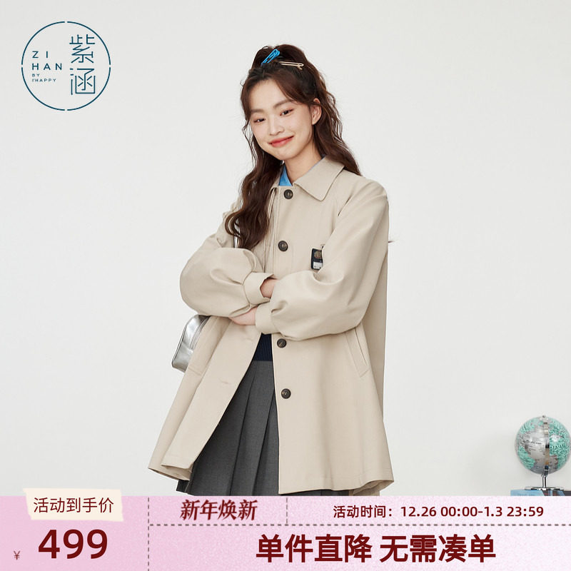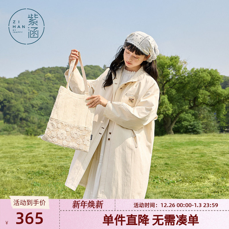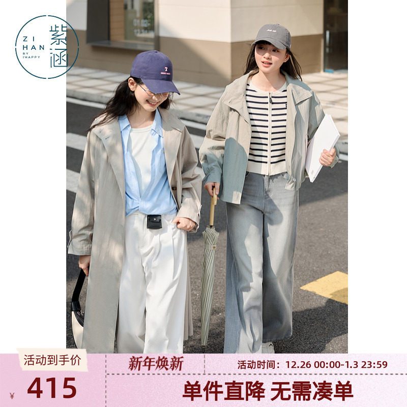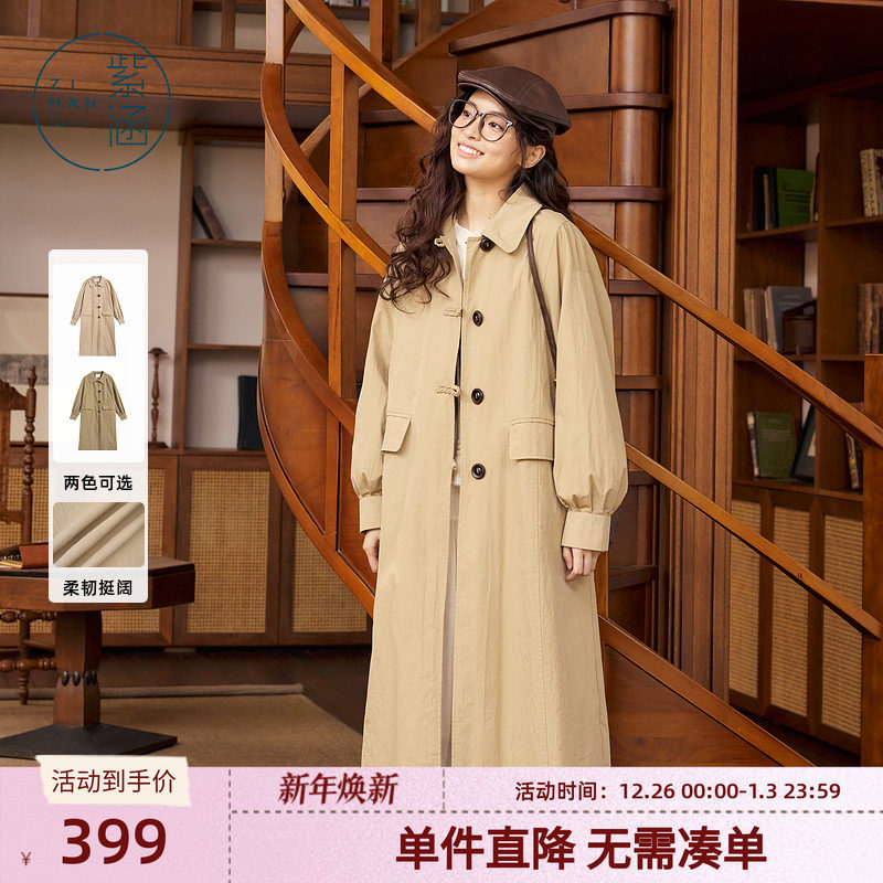 紫涵中长款翻领风衣女春秋季新款设计感简约自然清新宽松休闲外套