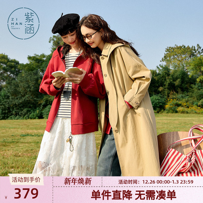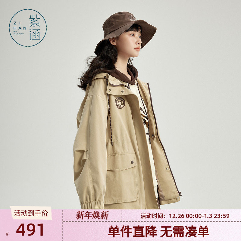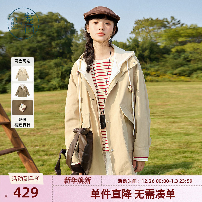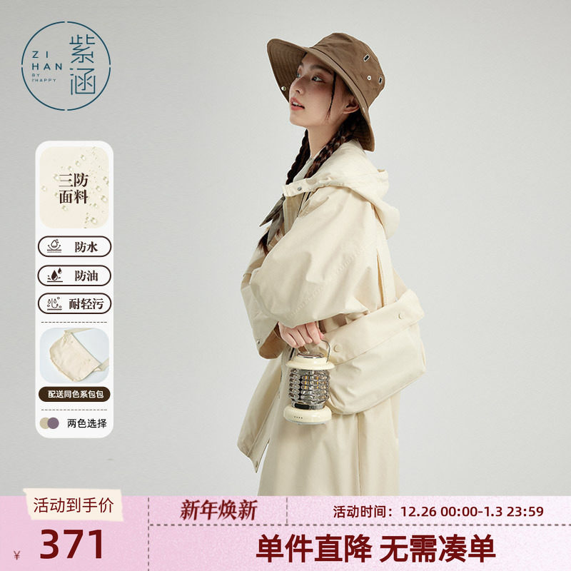 紫涵【三防户外】连帽拉链风衣女春秋季新款宽松直筒中长款外套潮