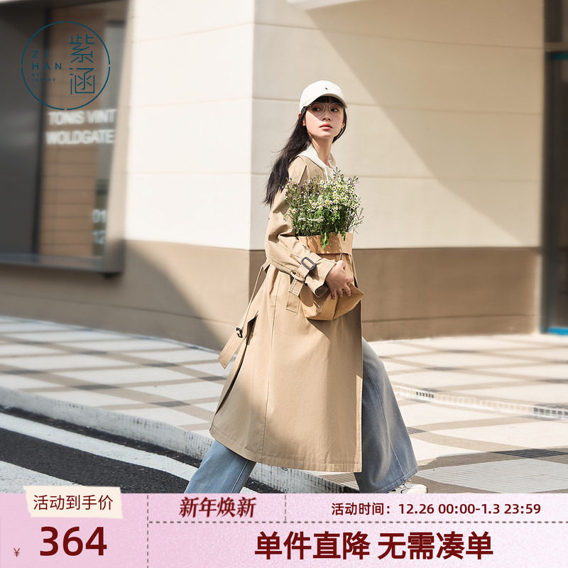 紫涵长款翻驳领风衣女春秋季新款英伦风宽松显瘦防风休闲通勤外套