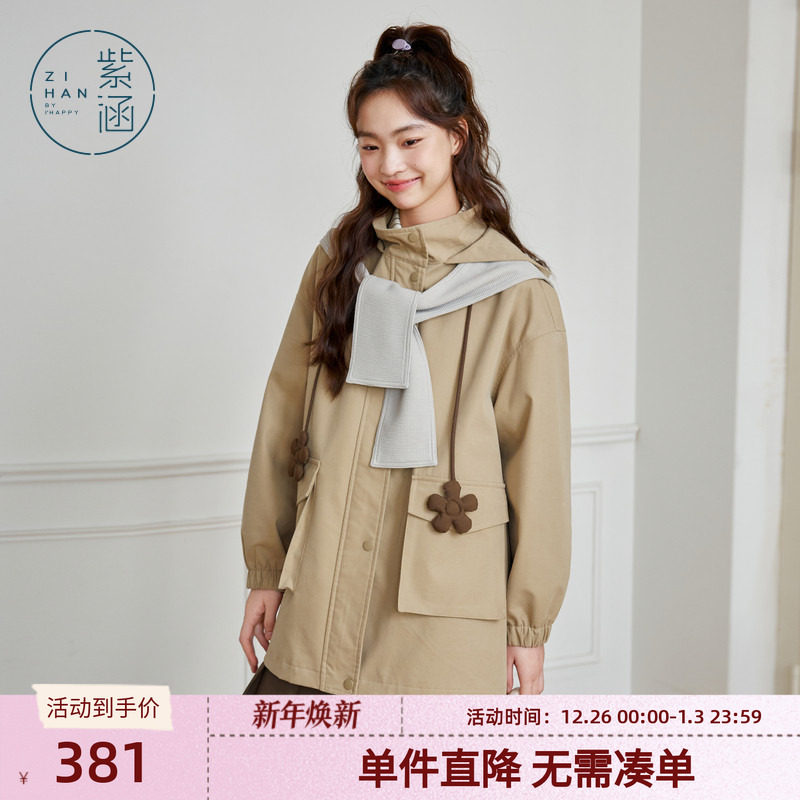 紫涵立领连帽大口袋风衣女春秋季新款甜美设计感宽松显瘦户外外套