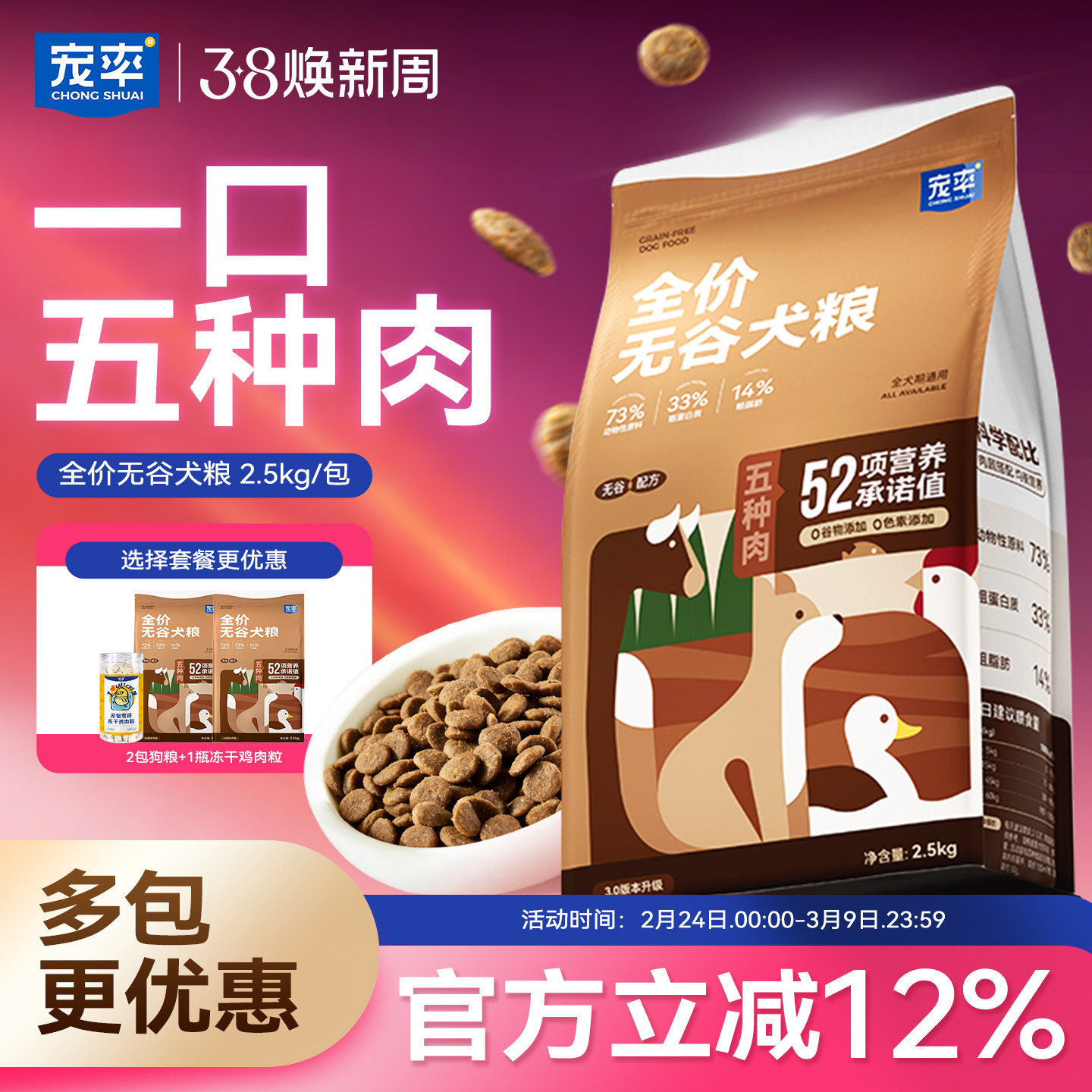 宠率狗粮鲜肉无谷金毛拉布拉多法斗柴犬马犬边牧中大型成犬幼犬粮