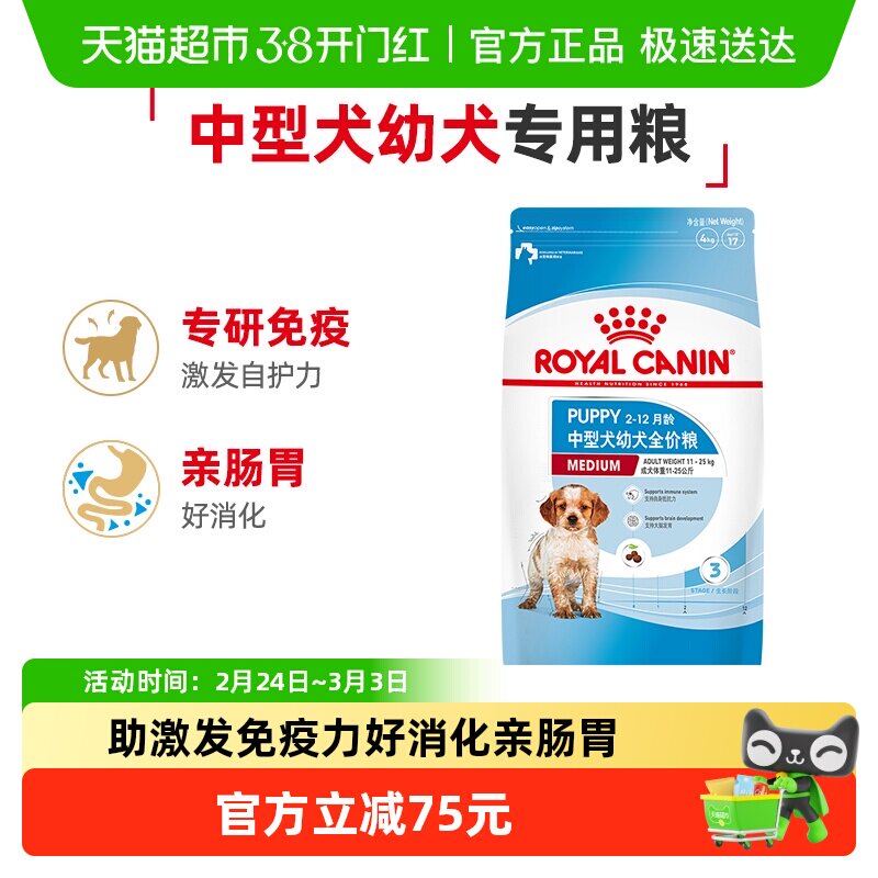 皇家狗粮MEJ32中型犬幼犬全价粮4kg柯基拉布拉多金毛离乳期专用