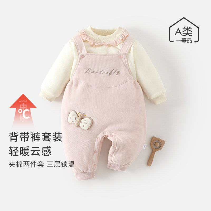 新生婴儿秋冬季保暖长袖上衣背带裤两件套男女宝宝夹棉套装外出服