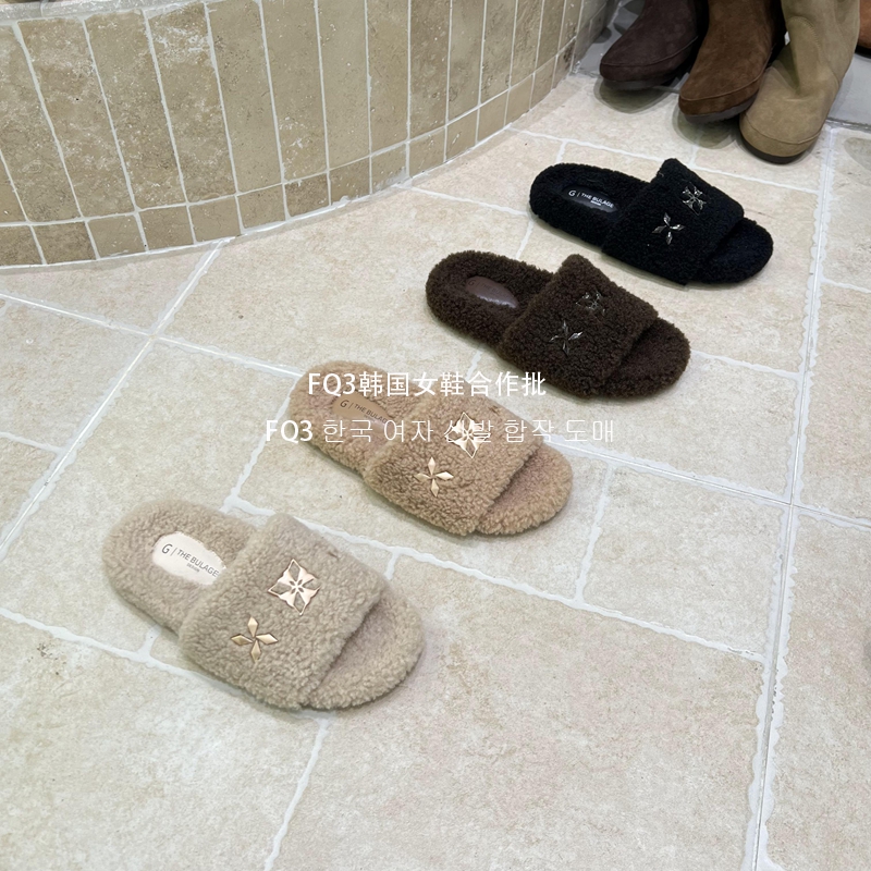 FQ3 实拍THE BULAGE秋冬新款羊羔毛一字带露趾毛毛鞋女防滑毛绒拖