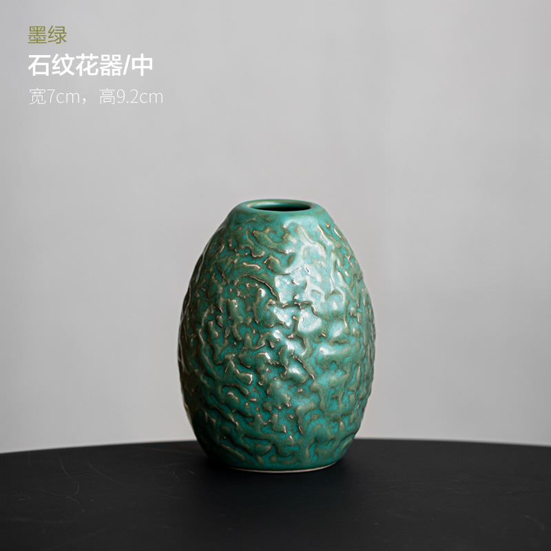 墨绿陶瓷石纹花器复古r风中小花瓶花插窑变粗陶中式禅意桌面摆件
