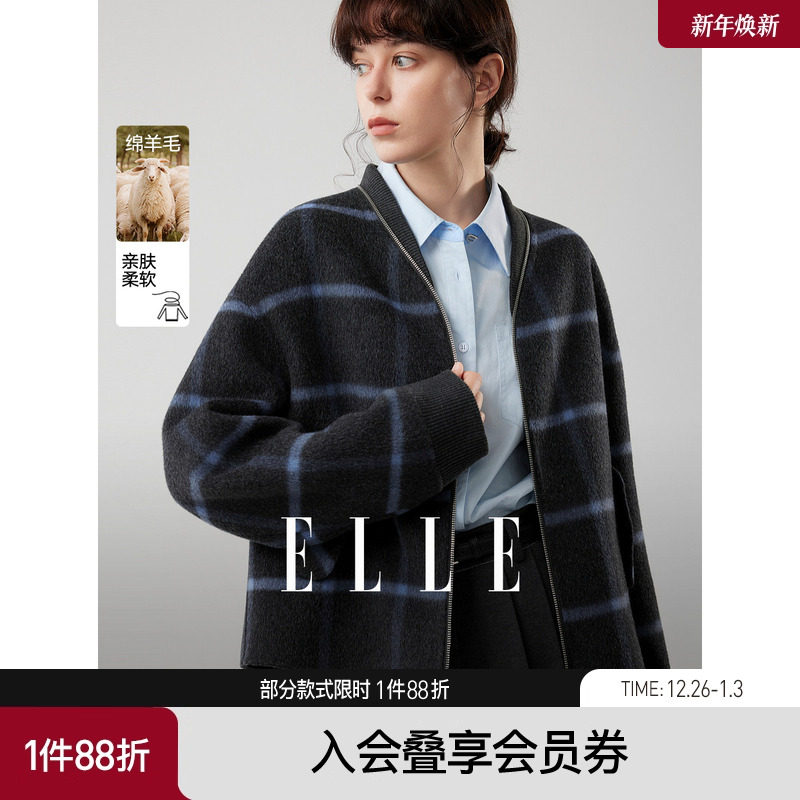 ELLE绵羊毛复古格纹棒球服女2025冬季新款设计感双面毛呢短外套