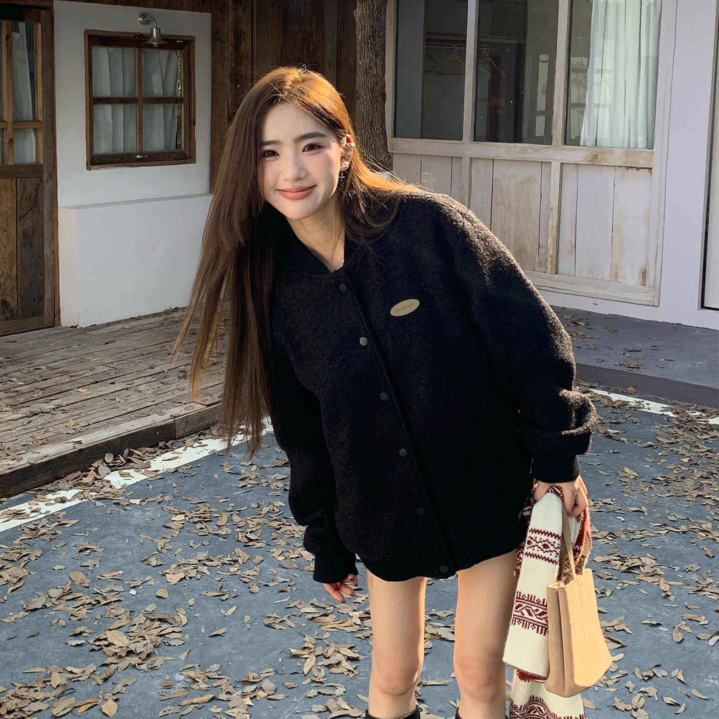 橘子树在哪儿复古黑色毛呢外套女秋季慵懒休闲宽松显瘦百搭棒球服