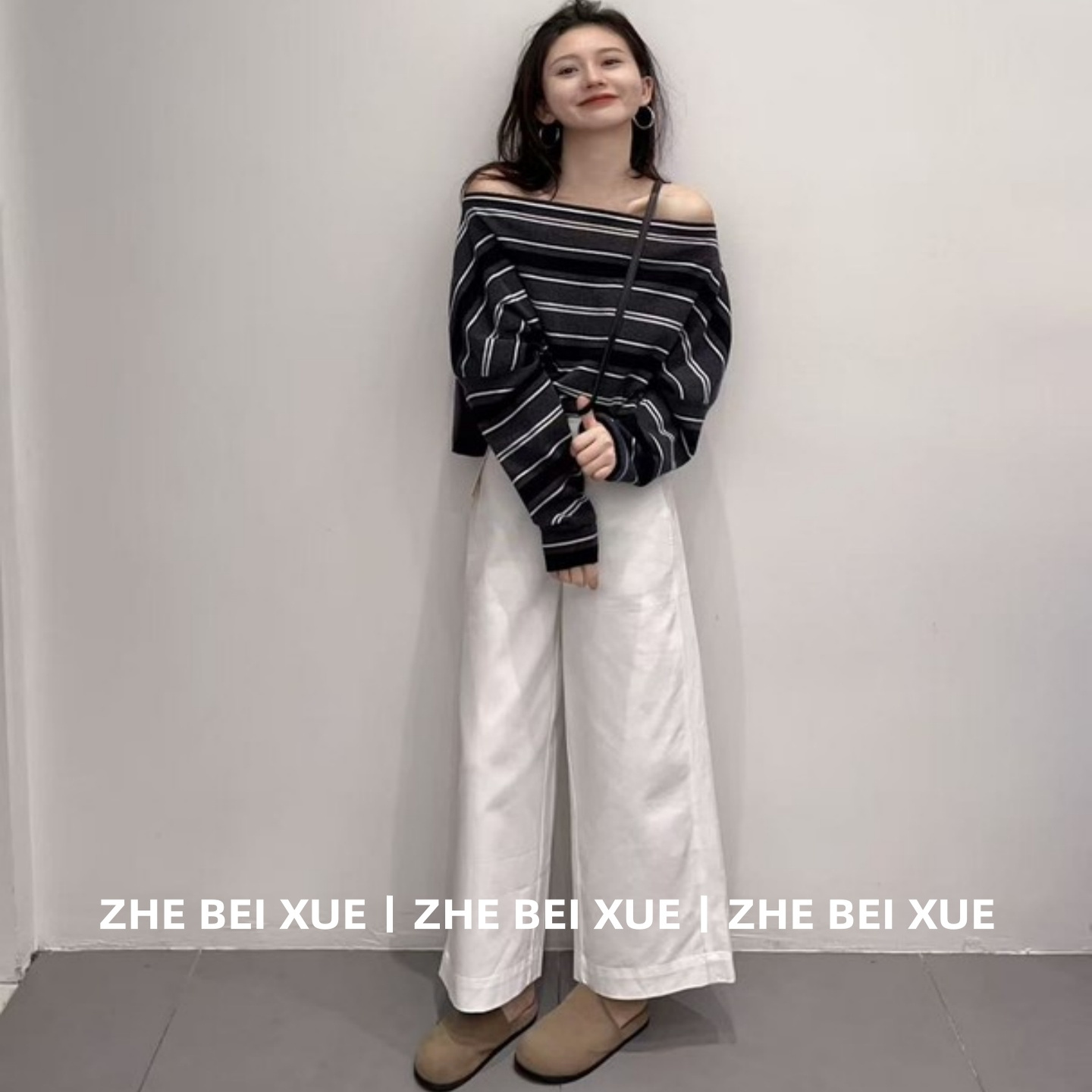 套装女法式慵懒风斜肩条纹上衣高腰百搭阔腿裤巨好看的早秋一整套