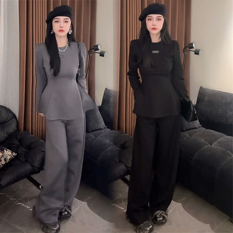 时尚套装女2025春秋季新款港风收腰显瘦长袖外套阔腿拖地裤两件套