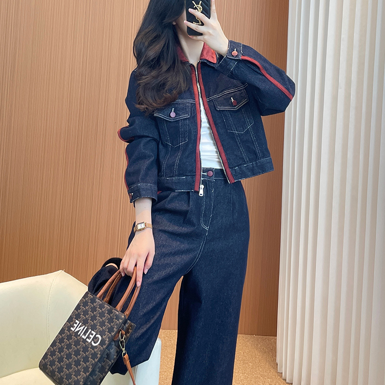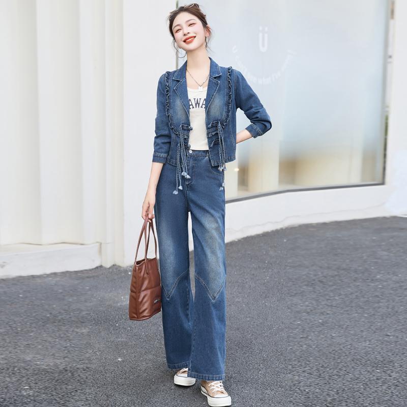 牛仔阔腿裤套装女2024春秋新款时尚休闲减龄显瘦短外套洋气两件套