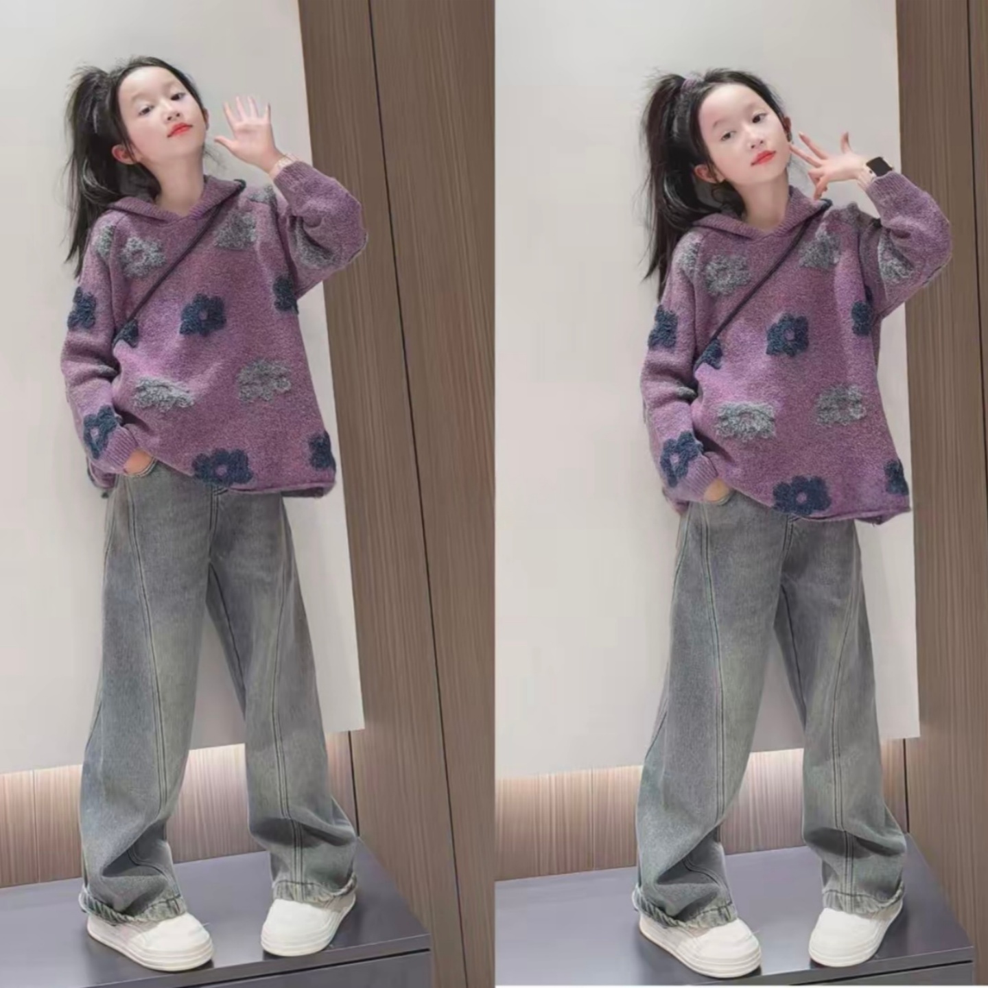 韩系氛围感套装女童紫色提花连帽毛衣秋冬新款复古加绒牛仔阔腿裤
