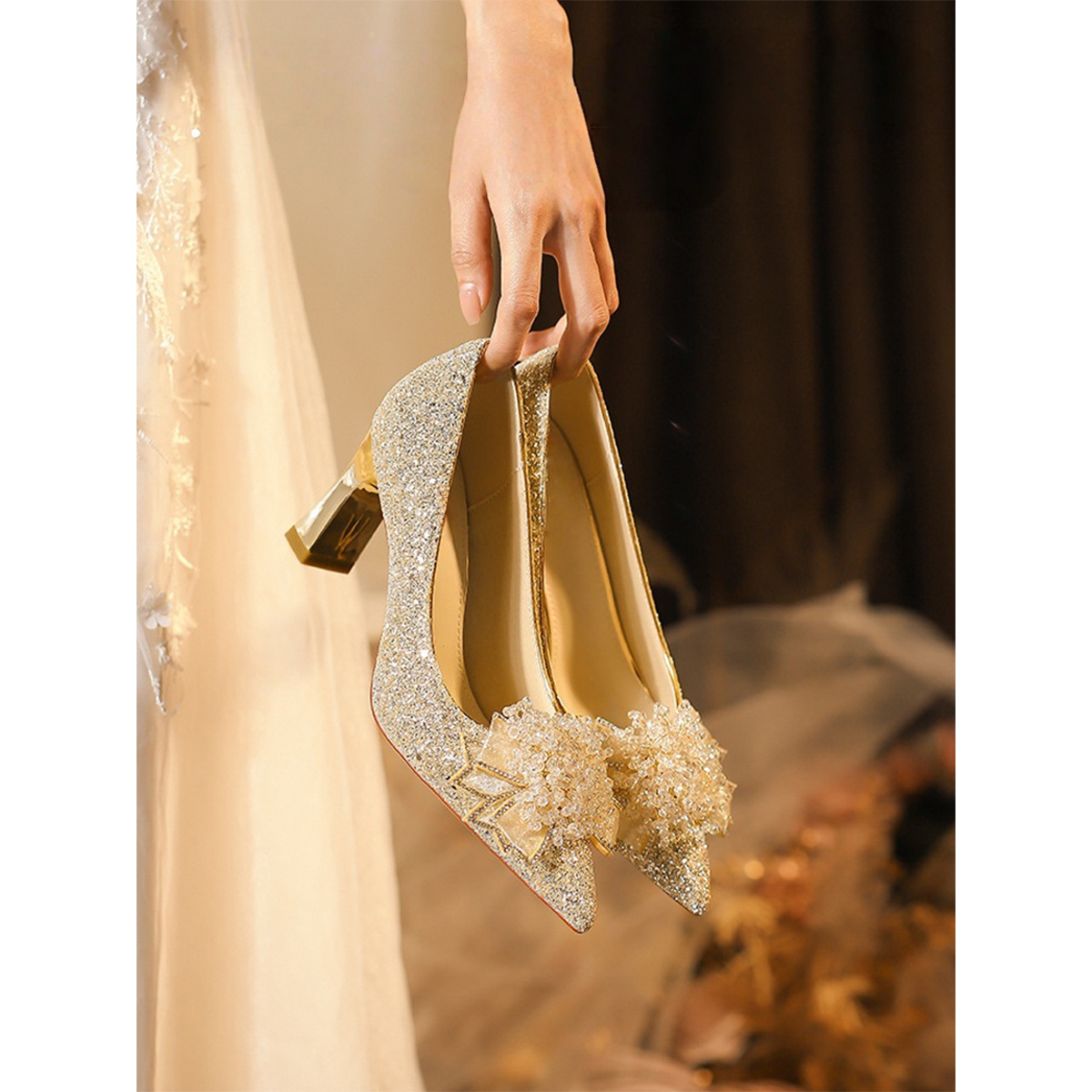 金色婚鞋女2025年新款新娘鞋秀禾婚纱两穿高级感亮片高跟鞋水晶鞋