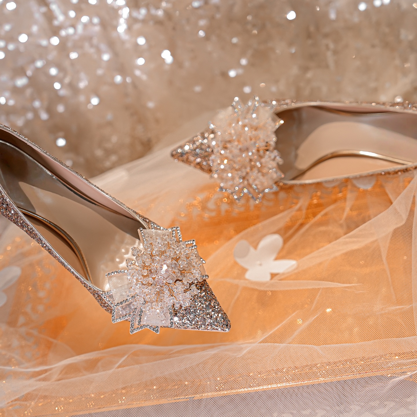 婚鞋秀禾婚纱两穿水钻水晶鞋成人礼亮片高跟鞋女法式绝美新娘单鞋