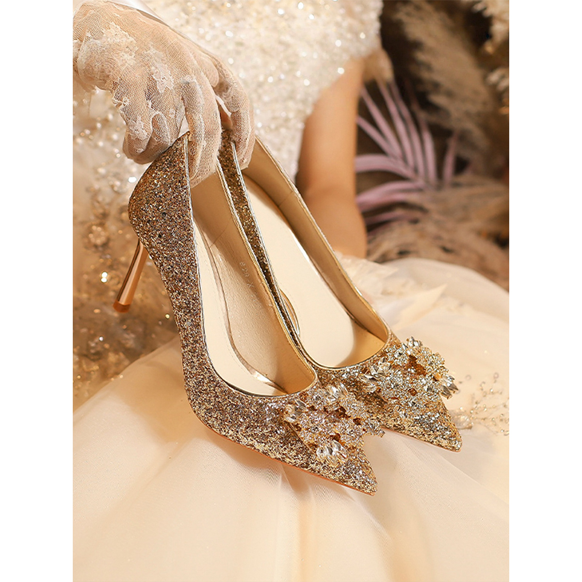 法式主婚纱婚鞋女新娘鞋礼服订婚水晶鞋尖头细跟香槟色亮片高跟鞋