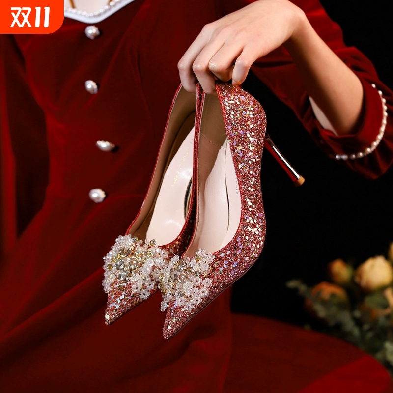 婚鞋女高跟鞋新中式秀禾婚纱两穿亮片高跟鞋红色不累脚尖头新娘鞋