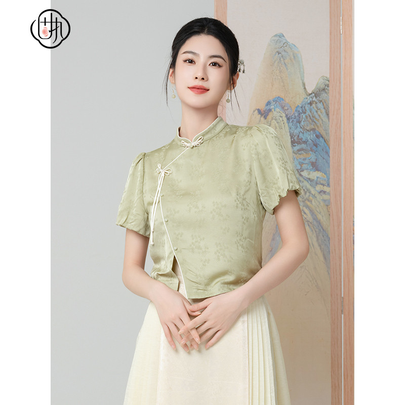 pusumede 新中式泡泡袖短袖衬衫女夏设计感国风盘扣小衫短款上衣
