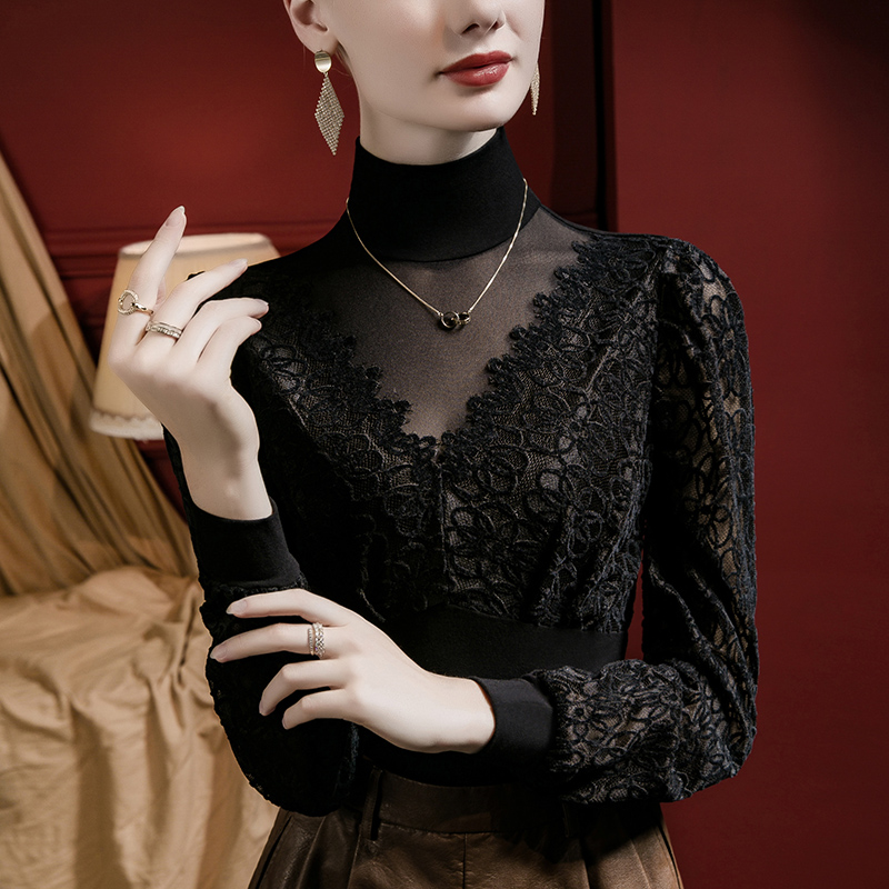 2025秋季新款高领泡泡袖蕾丝上衣女修身网纱拼接淑女气质冬季小衫
