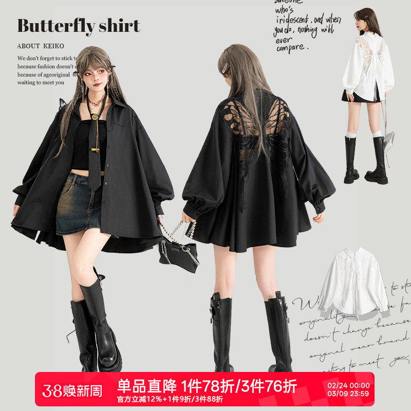 KEIKO 蝴蝶刺绣黑色长袖衬衫2026早春高级感泡泡袖上衣宽松防晒衫