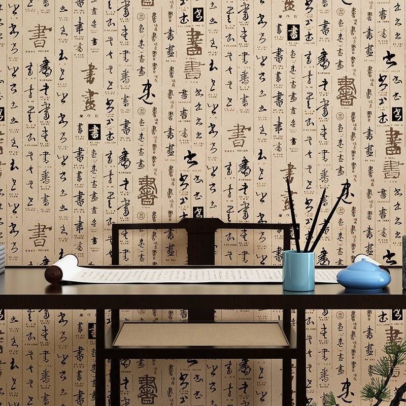 复古餐厅中式壁纸茶道书法茶室墙纸自带胶茶楼包间茶叶店面墙纸贴