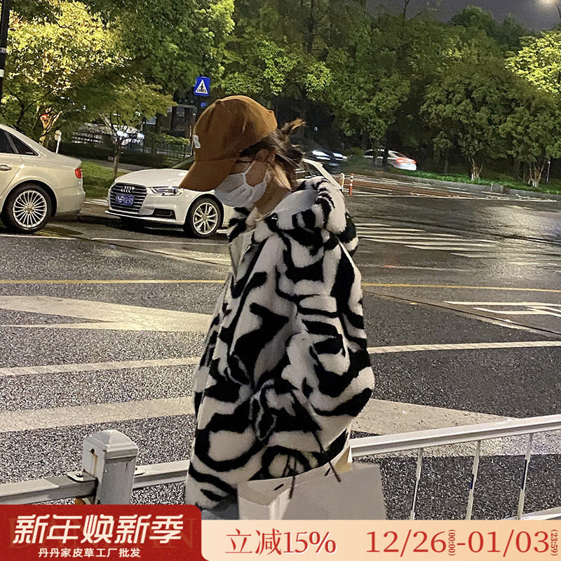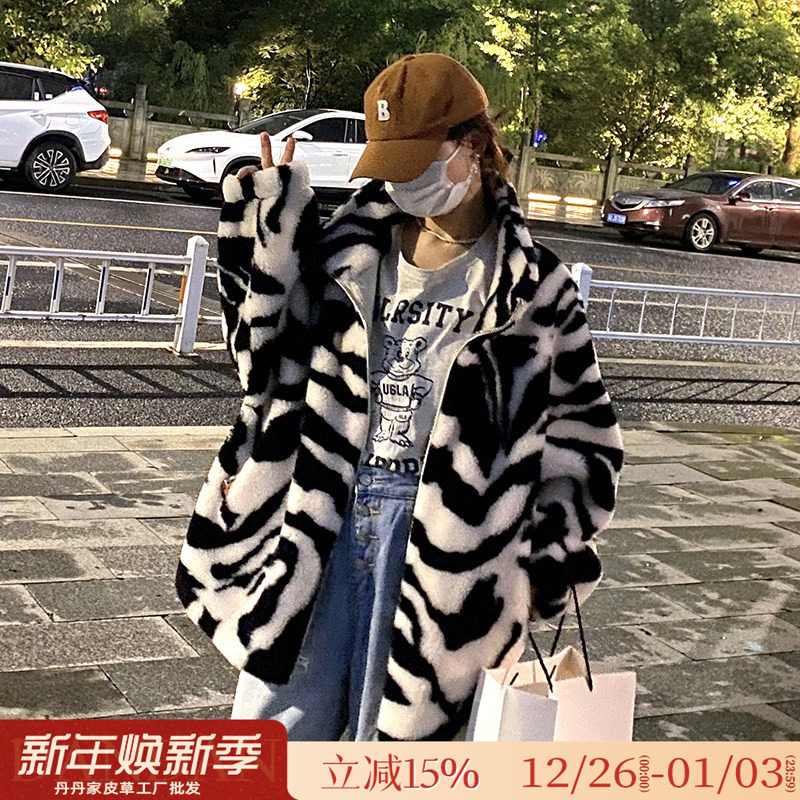羊剪绒大衣女2025新款中长款连帽斑马羊毛皮毛一体颗粒绒皮草外套