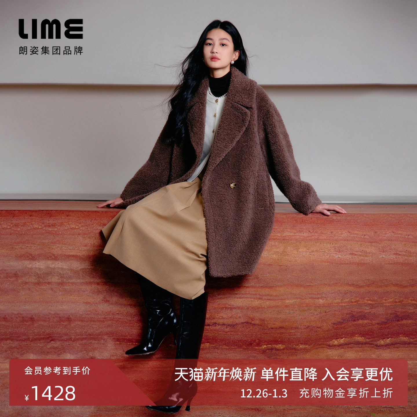 LIME莱茵优雅宽松廓形羊剪绒中长大衣秋冬新款翻领时尚羊毛外套