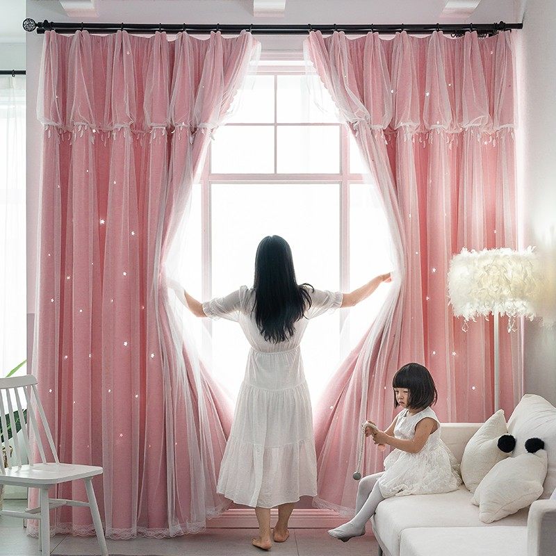 窗帘粉色儿童房女孩双层带纱公主风卧室遮光布少女梦幻星空粉红色
